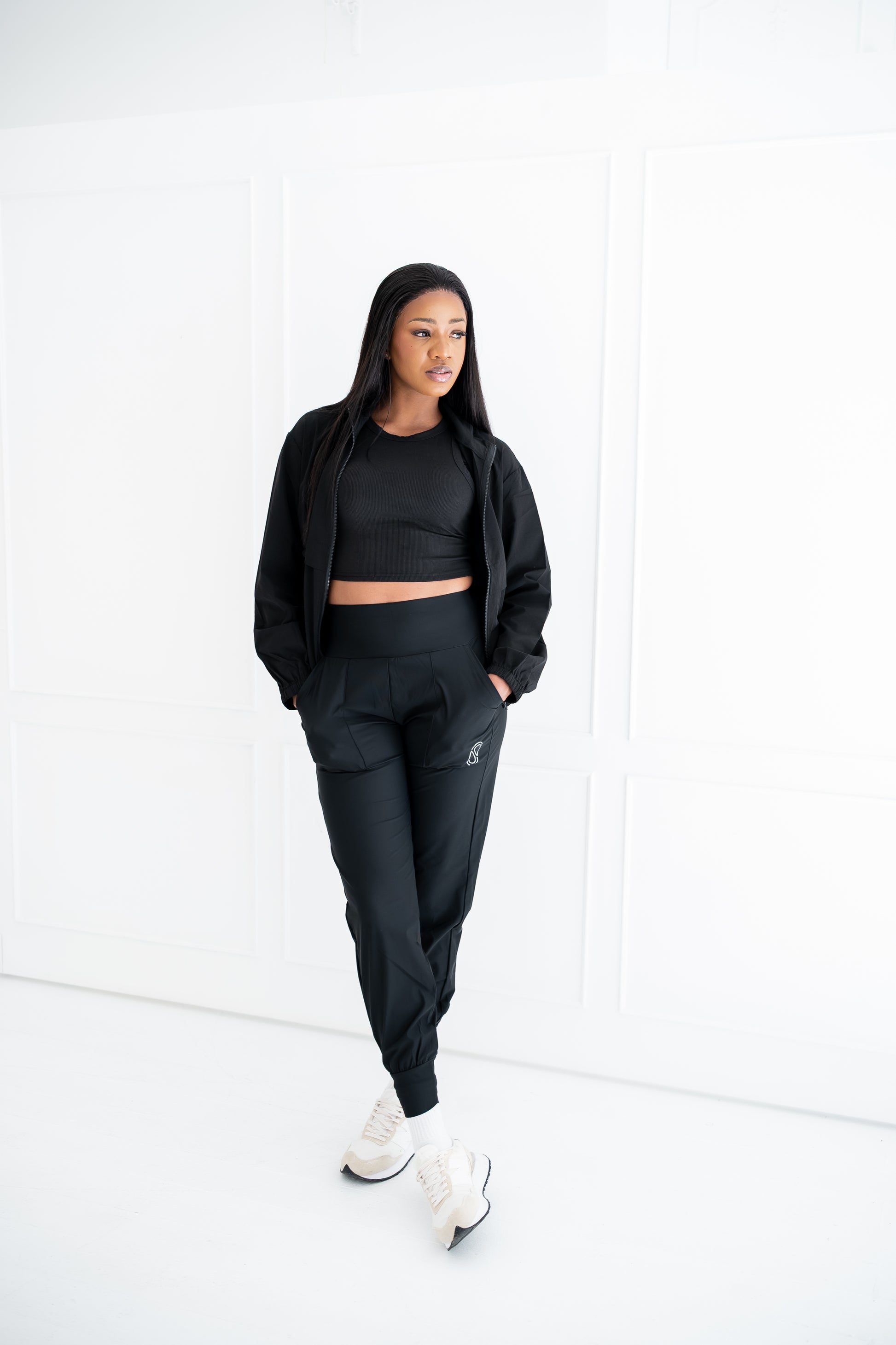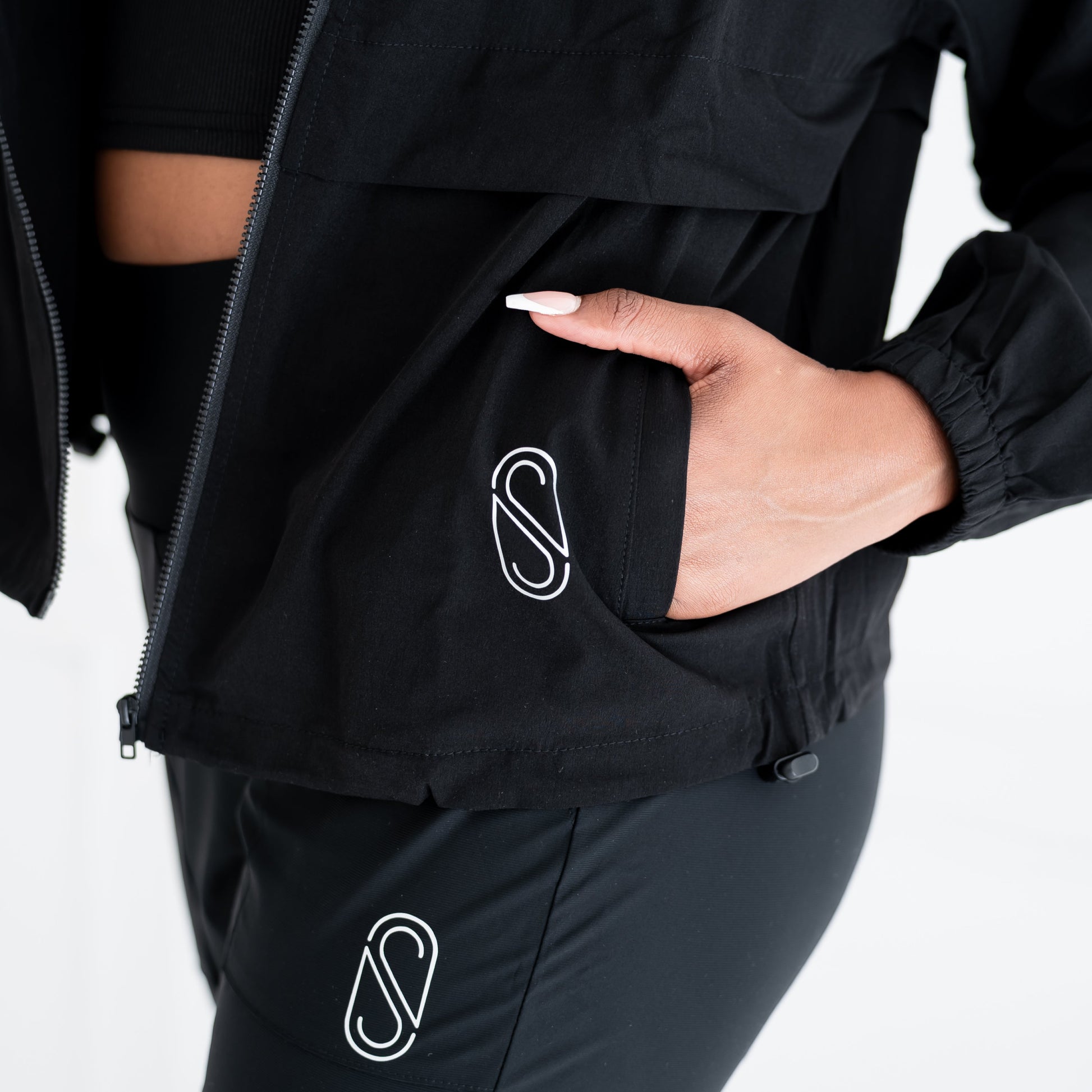 Crafted from breathable fabric, this jacket features a sleek front zip, subtle paneling for added shape, and an adjustable drawcord hem to tailor your fit. The heat-pressed signature “S” logo adds a bold yet minimal finishing touch, making it perfect for athleisure, travel, or casual wear.