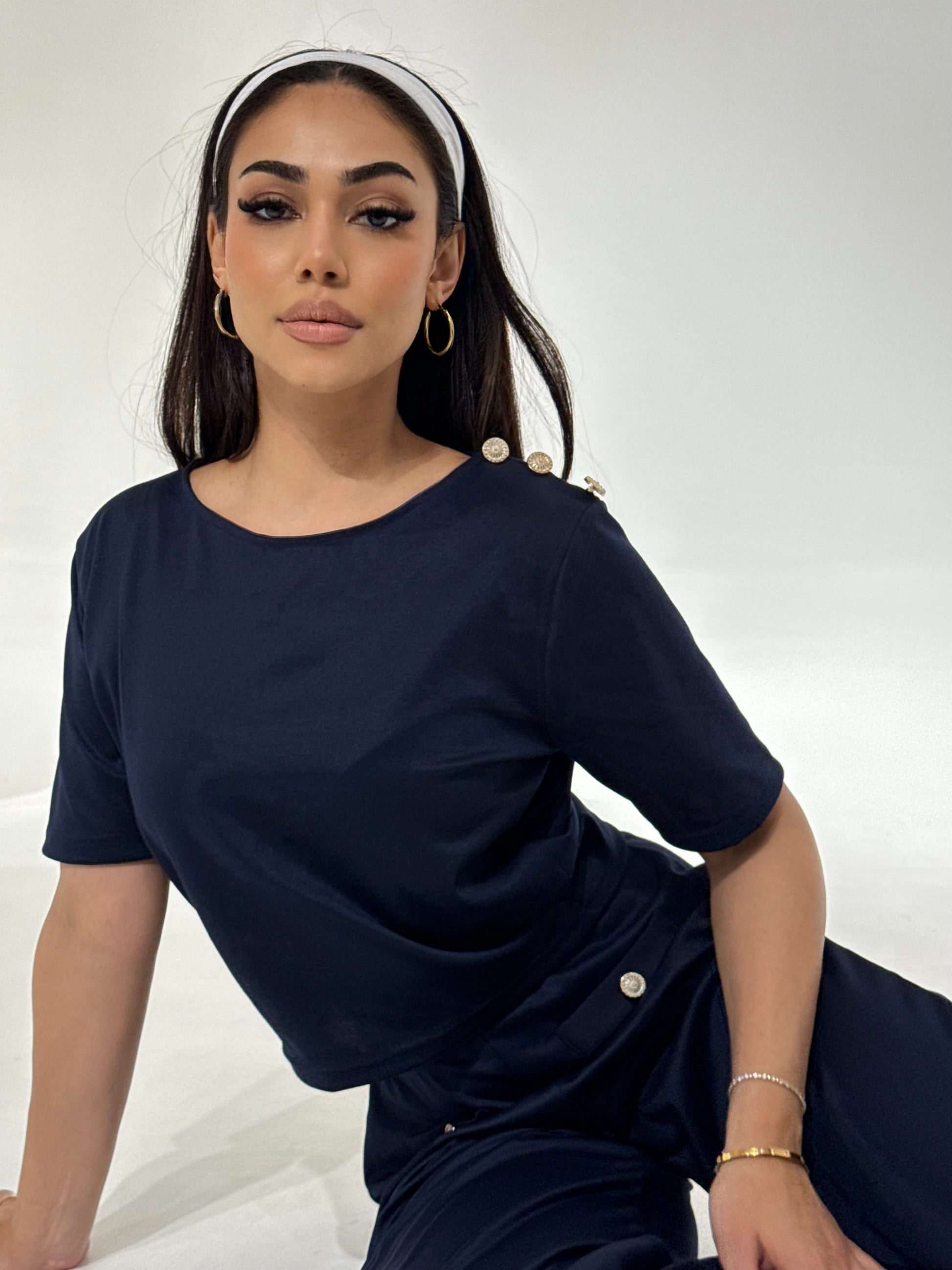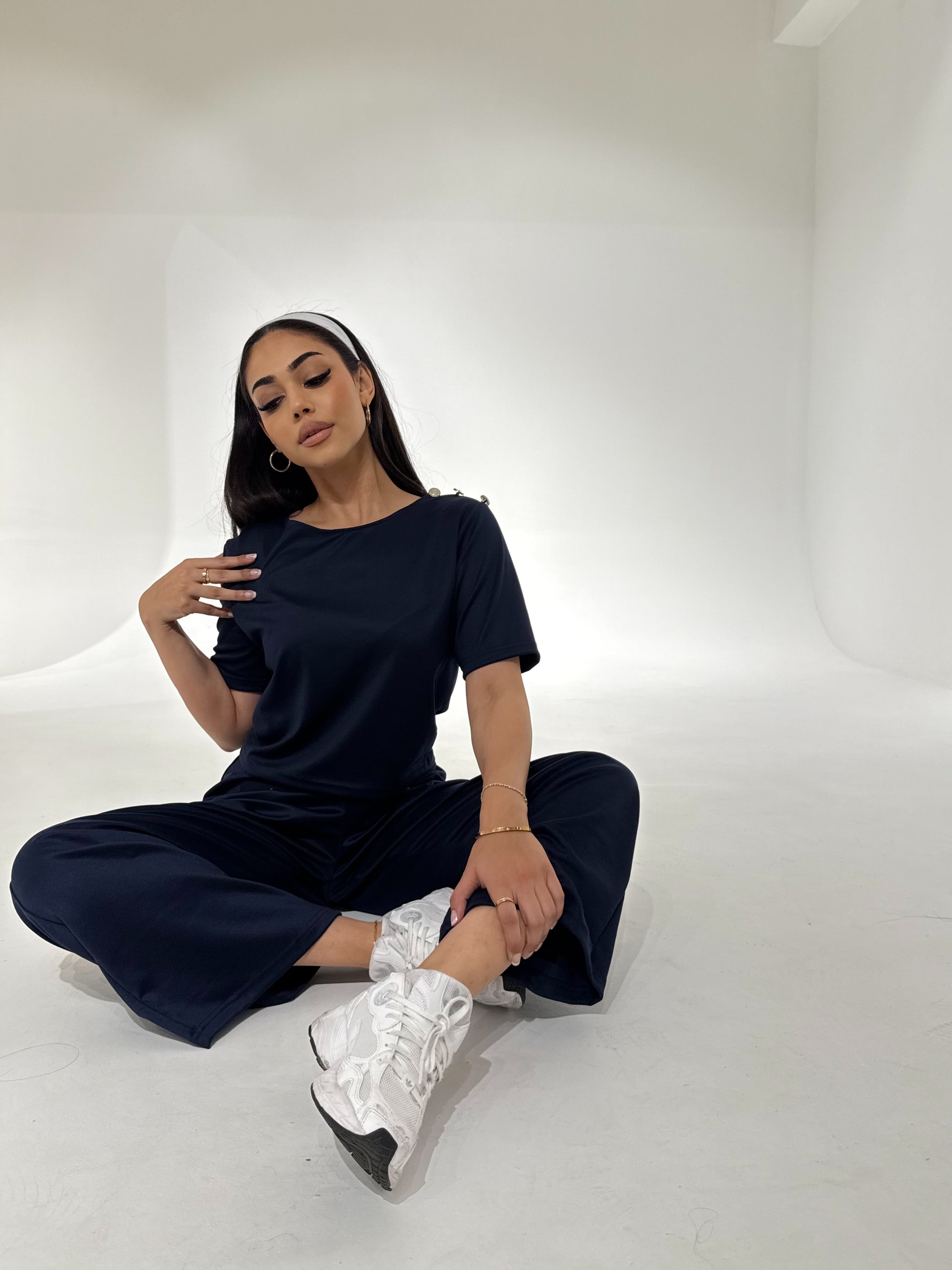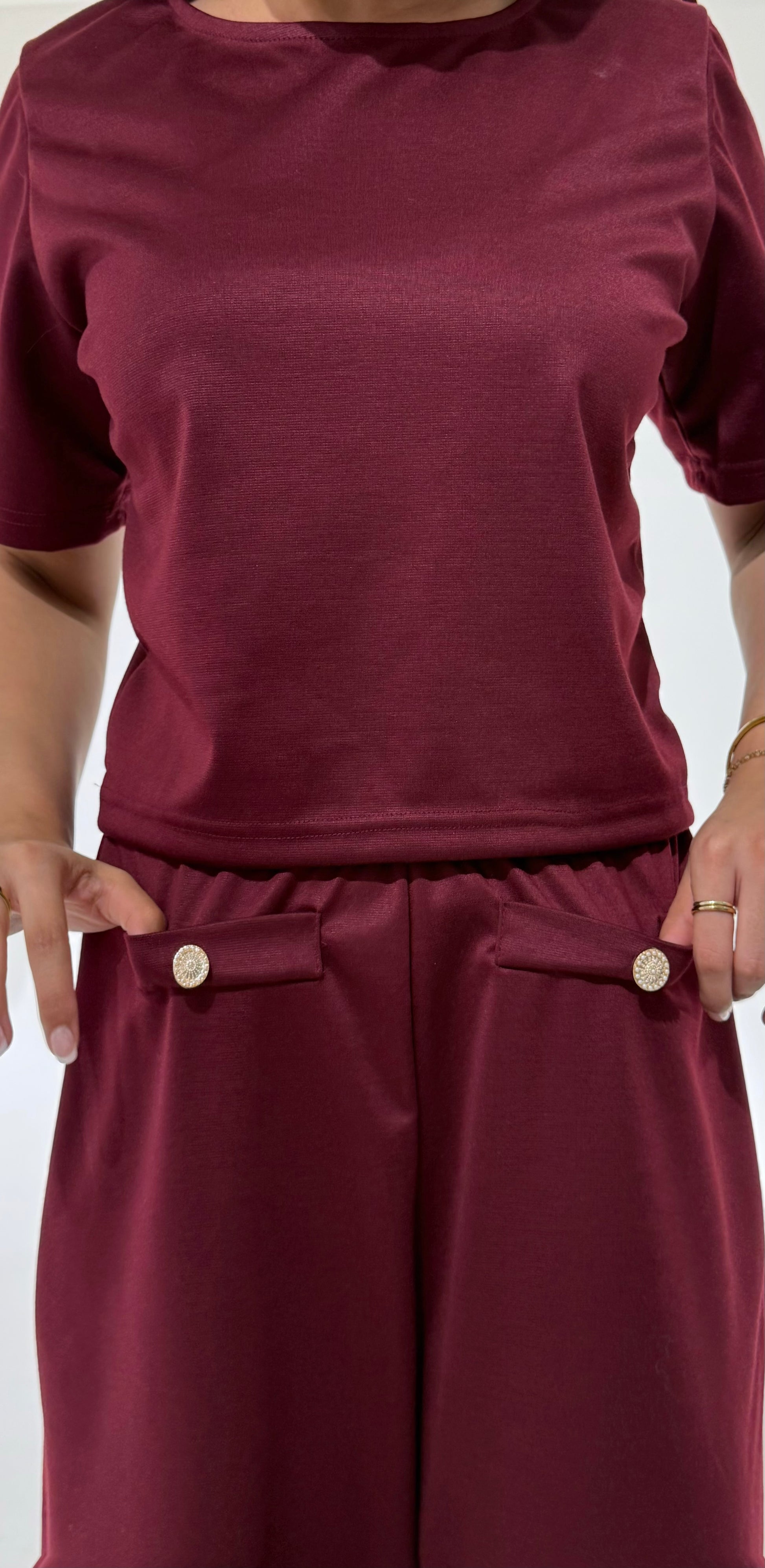 Effortless and elevated. The Serene Set features a relaxed top and wide-leg pants with a flattering drape. Finished with three side buttons for a refined touch — comfort and polish in perfect balance. Available in Navy & Maroon